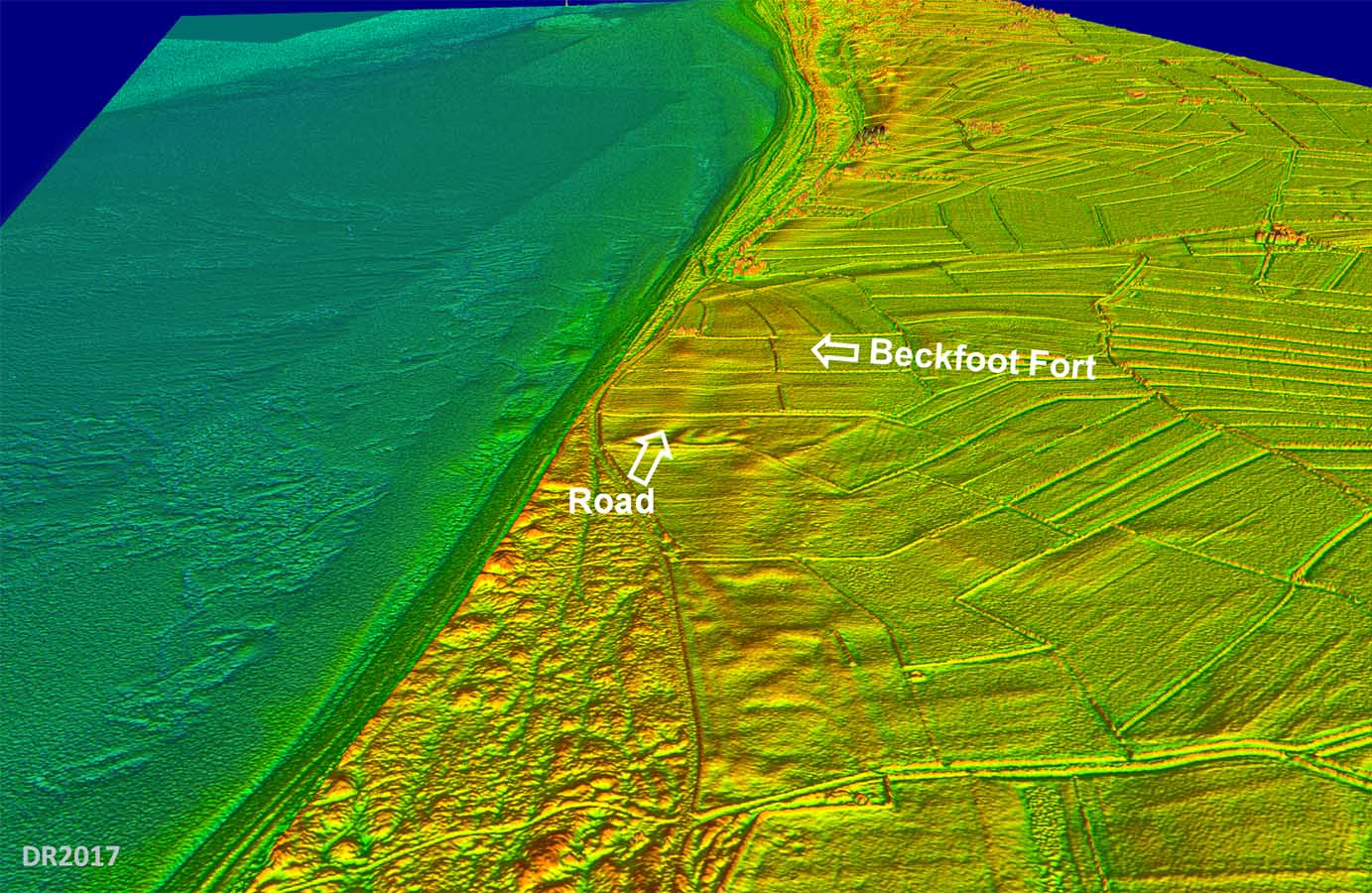 3D Lidar Image - Beckfoot looking north towards Silloth The only trace of road I have spotted. And it is a trace - just the faintest of indications of a road from the south gate of Beckfoot Fort. This agrees with the location on aerial photographs taken by Barri Jones. The suspicion is that it is a local link road rather than the actual main road. The inference from here and the other locations is that the modern coast road (B5300 and A596 further south) overly the Roman line.