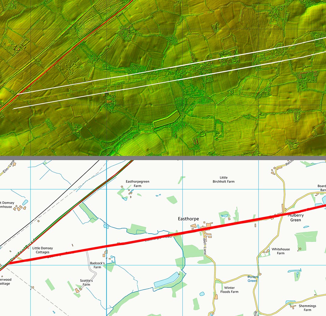 Lidar Image and Route Map 3 The last stretch follows Easthorpe Road before joining up with the main Colchester to Chelmsford Roman road.