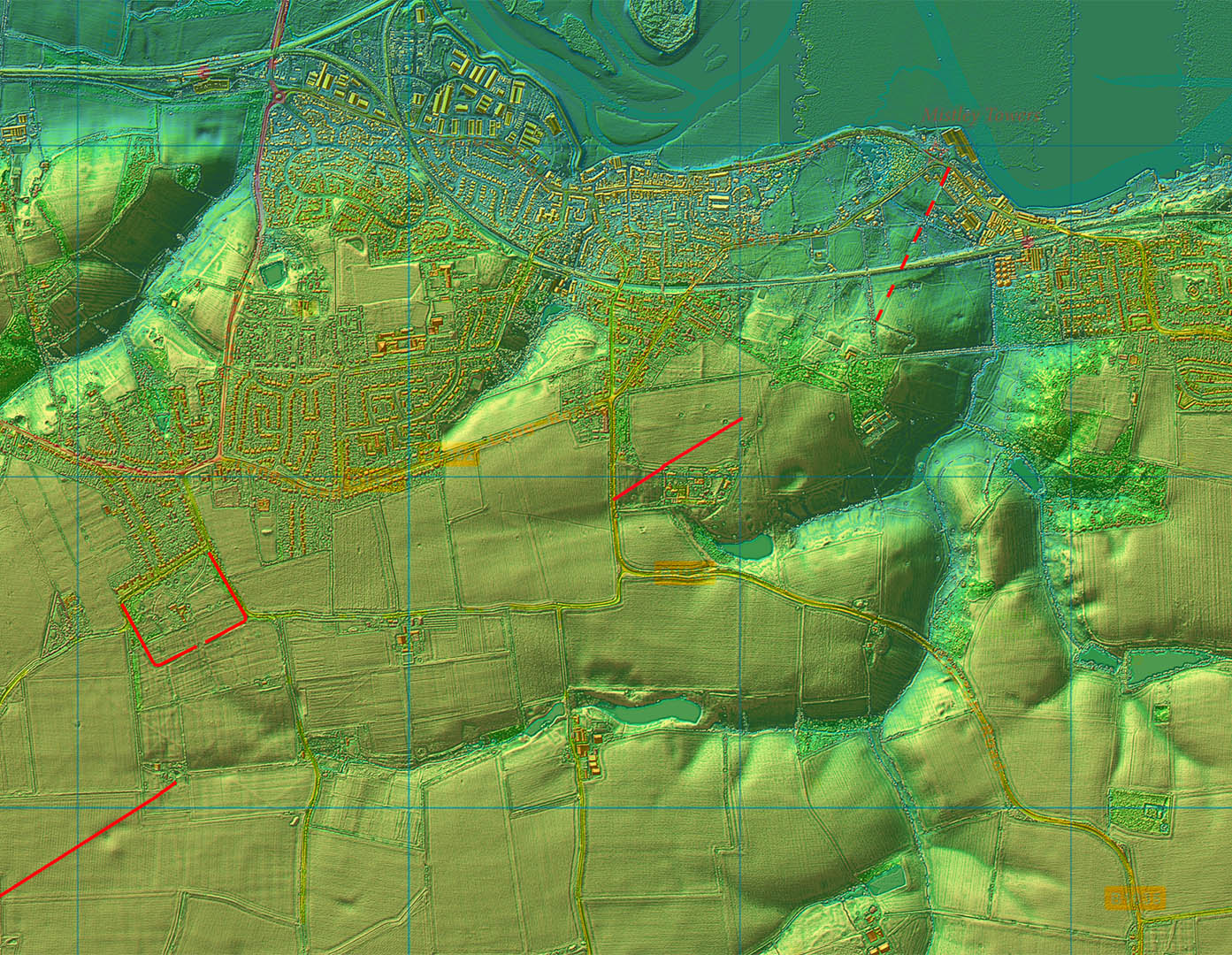 A branch off the road to Lawford was previously suspected from aerial photography but only for a short distance. We can now, with LiDAR, extend this all the way to Harwich with reasonably high confidence. Why Harwich? At Harwich then the “Harwich Stone Band” rock outcrops and is probably why this peninsular has survived coastal erosion. Stone outcropping here makes this part of the coast fairly unique being the only naturally occurring rocky shore from north of the Thames to the top of Norfolk. It is one of the few decorative stones native to Essex and was therefore a very important local resource. One of the Roman theatres in Colchester is believed to have used Harwich stone for its foundations. A Roman road to Harwich would therefore make perfect sense.