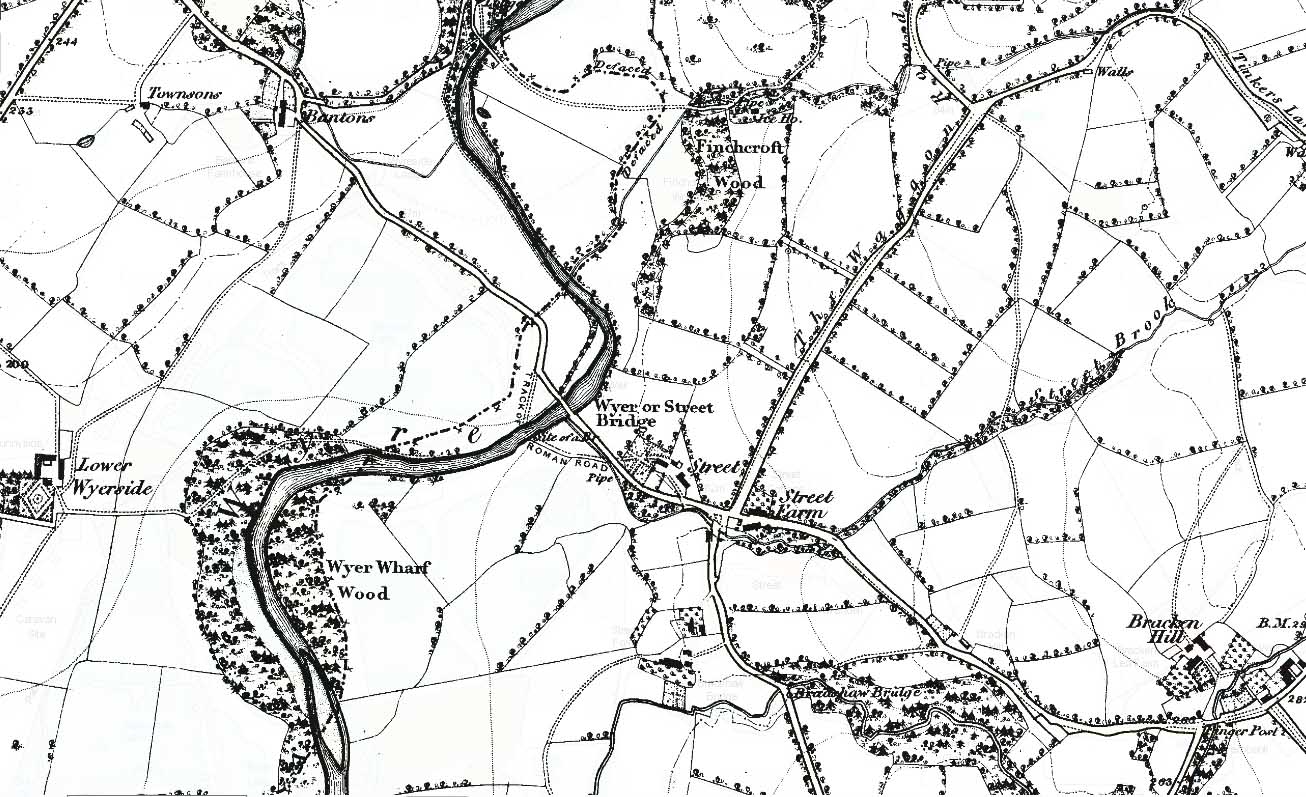 The old Street Bridge, shown on the map and downstream from the modern bridge was also discounted as being Roman by Ben Edwards.This is confirmed by the course of the Parish boundary here which clearly was based on the old meandering course of the River Wyre when parish boundaries were established (13th Century?). This doesn't even go near the old bridge!
