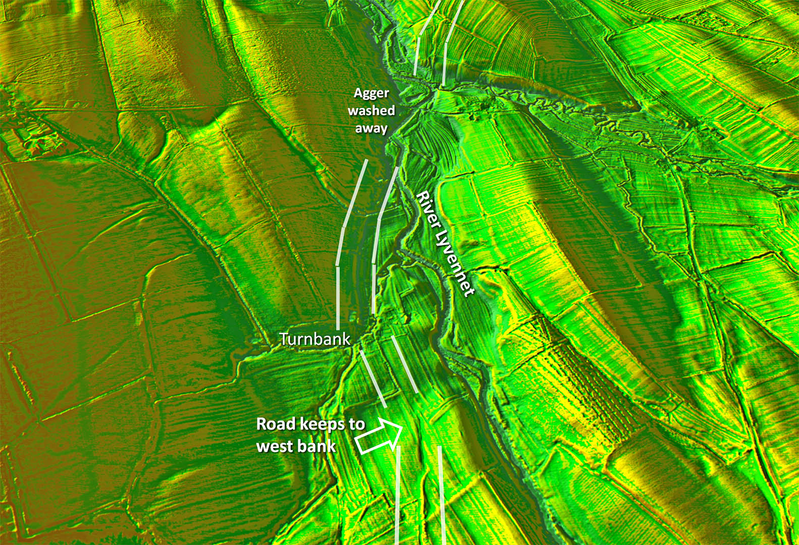 Oblique Lidar Image - Crossing the River Eden This is the last visible trace of the road. It is only a trace too being very faint but is certain as those features all line up and point directly to the fort.