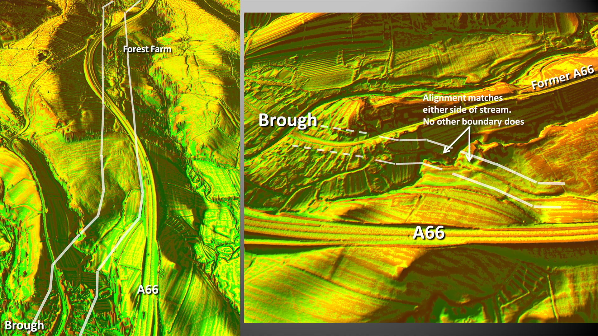 The southern route had always been a puzzle as it seems to branch off and then rejoin the A66. Thanks to that series 2 Lidar it became obvious there was also a northern route which must have been the earliest Roman line. Its proximity to the early signal towers is a strong indication that it must have been the original Roman line. The middle part of the northern route was known as Low Street. The southern route via Brough clearly branched off the original northern line and probably replaced it.