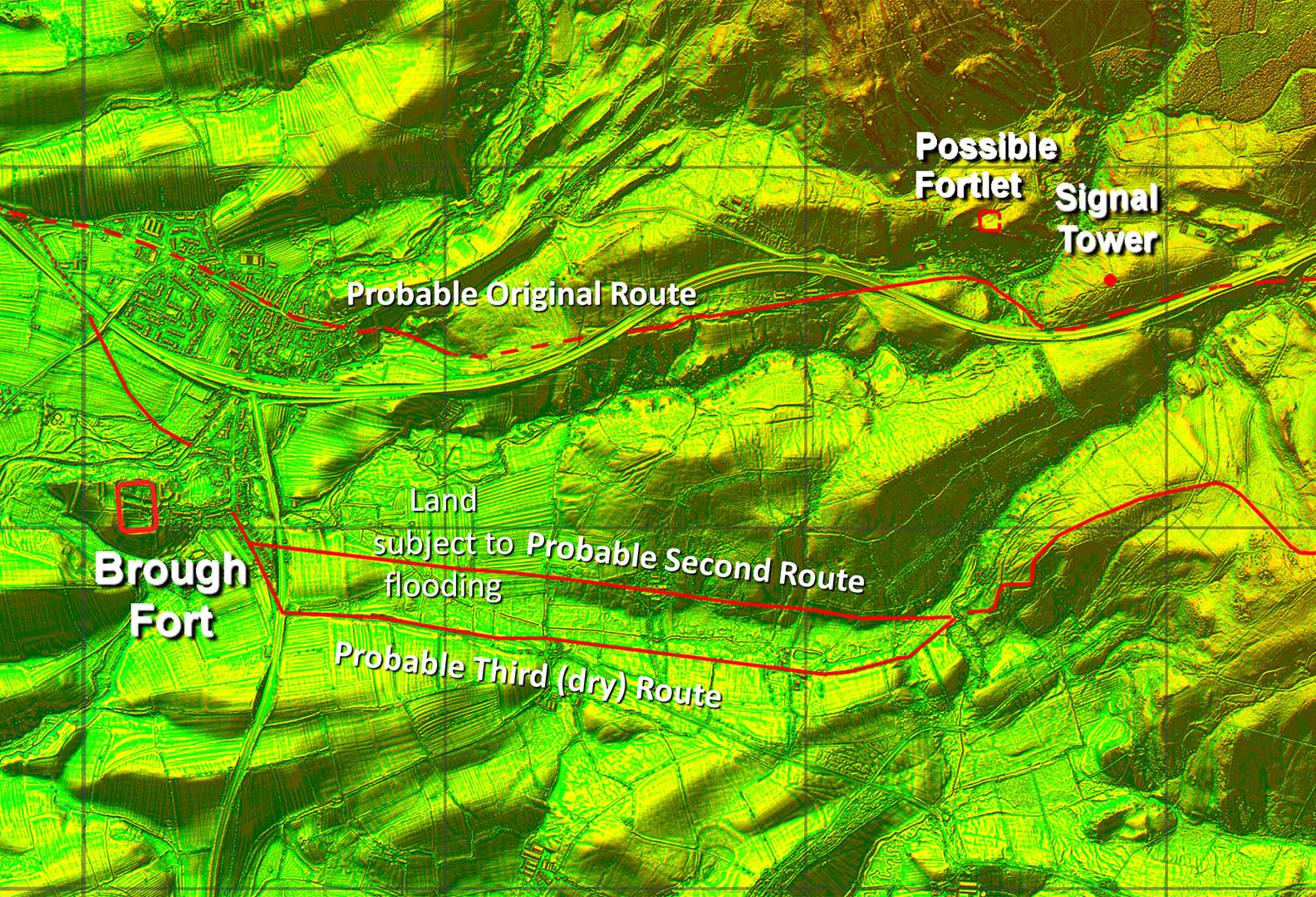 Why did Brough end up with 3 roads? The evidence of the alignments strongly suggests the northern route was the first. This was followed by a route to the fort (probable second route). However this route crossed low lying ground subject to frequent flooding. I gave a talk at Brough and was informed of this. The final, third, route was obviously a detour on to higher drier land to avoid the flood prone area.