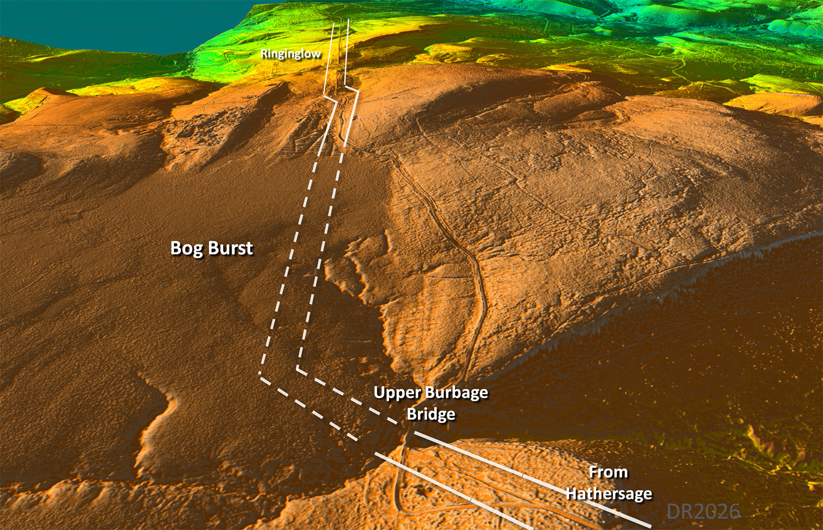 What I have shown is the route I would have chosen (as a former highway engineer) via Upper Burbage Bridge. There has clearly been a bog burst up there smothering part of the route. To me it is the best compromise on directness and amount of climbing.