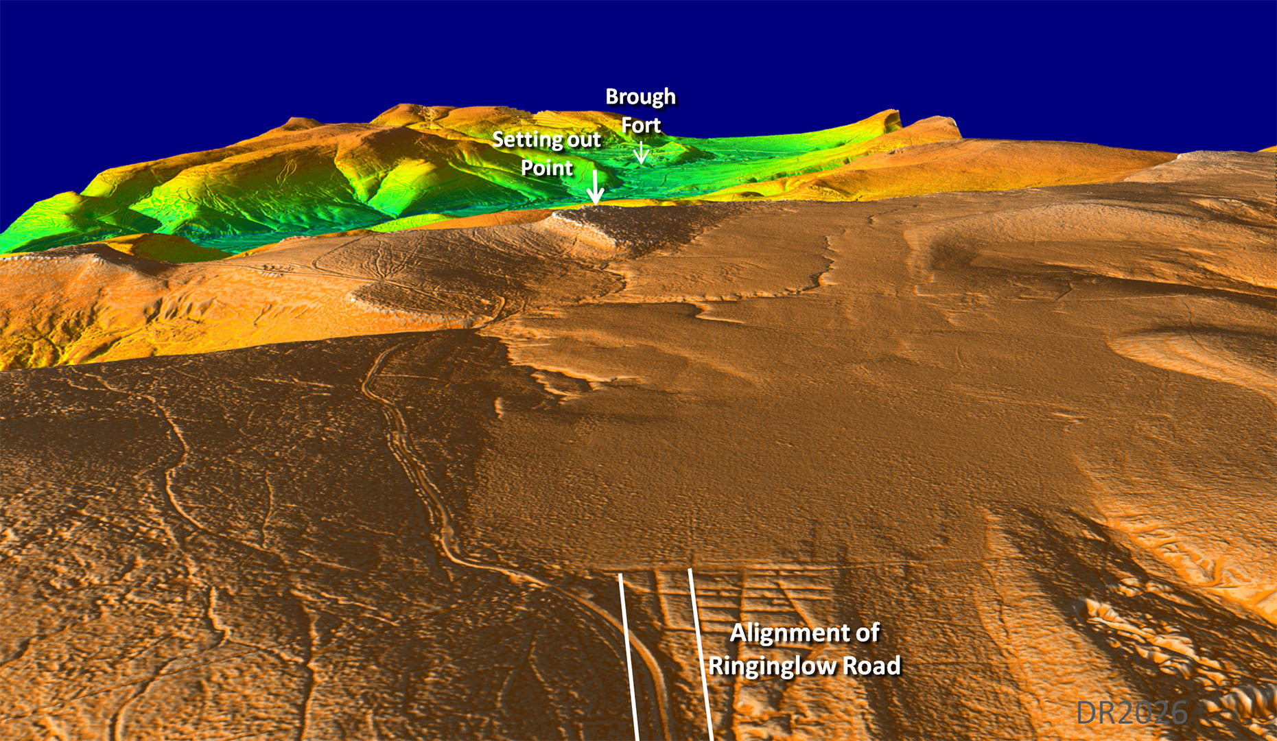 Roman road surveyors made use of high points to set out their roads. Ringinglow Road aligns with a summit which also has a clear view of Brough Fort. This summit at 457m does not appear to have a name but it does have a commanding view down the Hope Valley and, in the opposite direction, along Ringinglow Road. From that summit view point the road surveyor would have been able to work out the route for the road. A perfect setting out point.