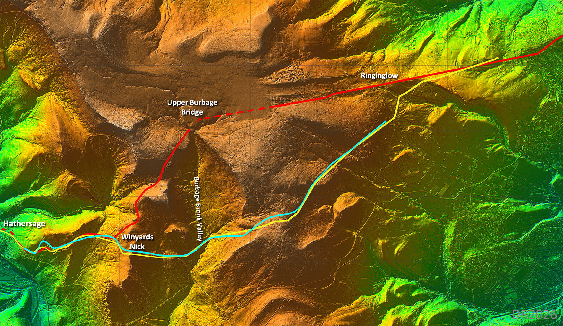 There are probably more options but perhaps these are the most likely ones. The HER and Mike's route are obviously the same with some minor adjustments here and there. They do have to descend and ascend in the Burbage Brook Valley. The red route avoids this by crossing that stream further north at Upper Bubage Bridge.