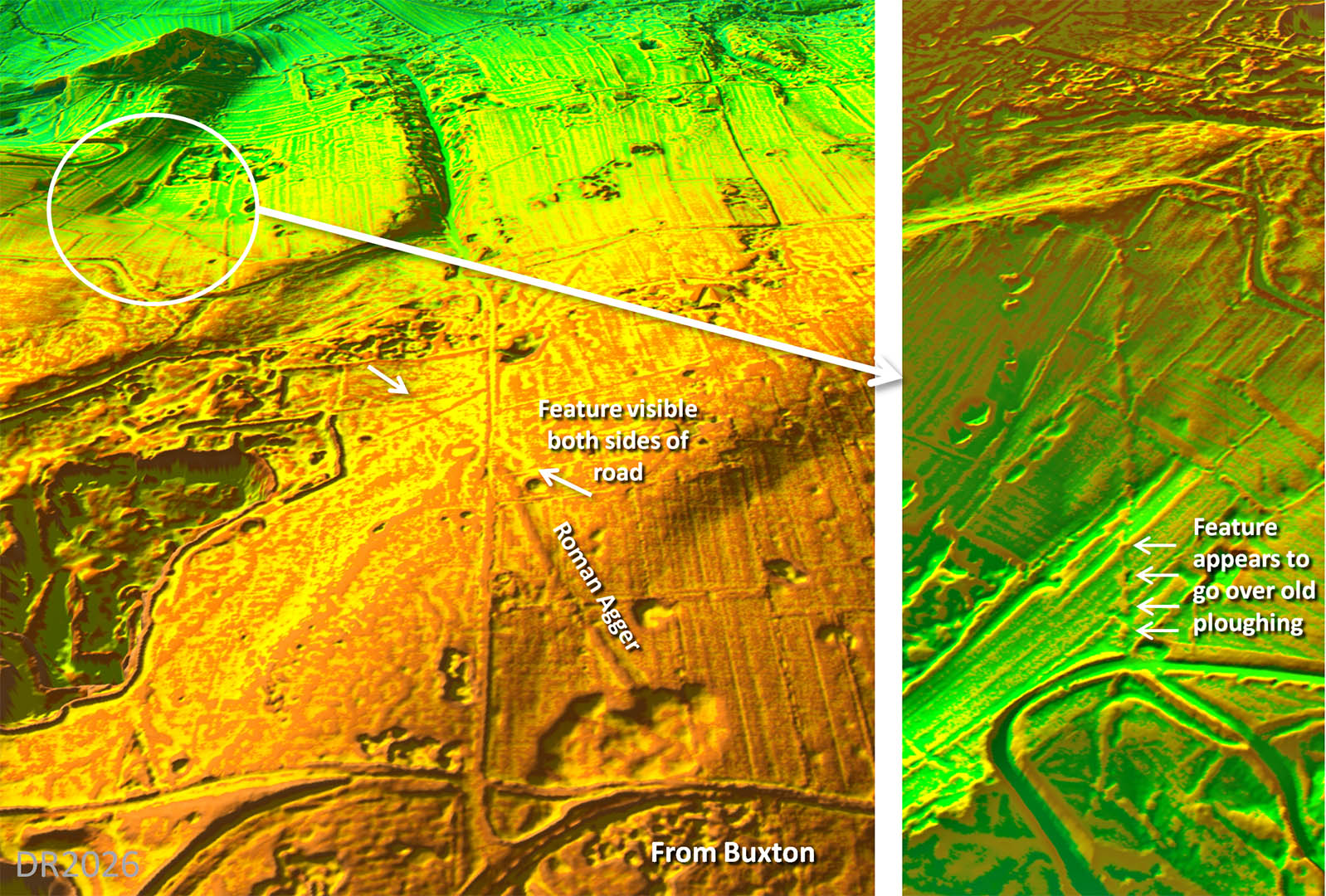 Oblique 3D Lidar Image - leaving Buxton The routes to Melandra and Brough shared a common route for the first mile or so. However, it is clear the route to Brough must have been a later road as it is a branch off the Melandra road.