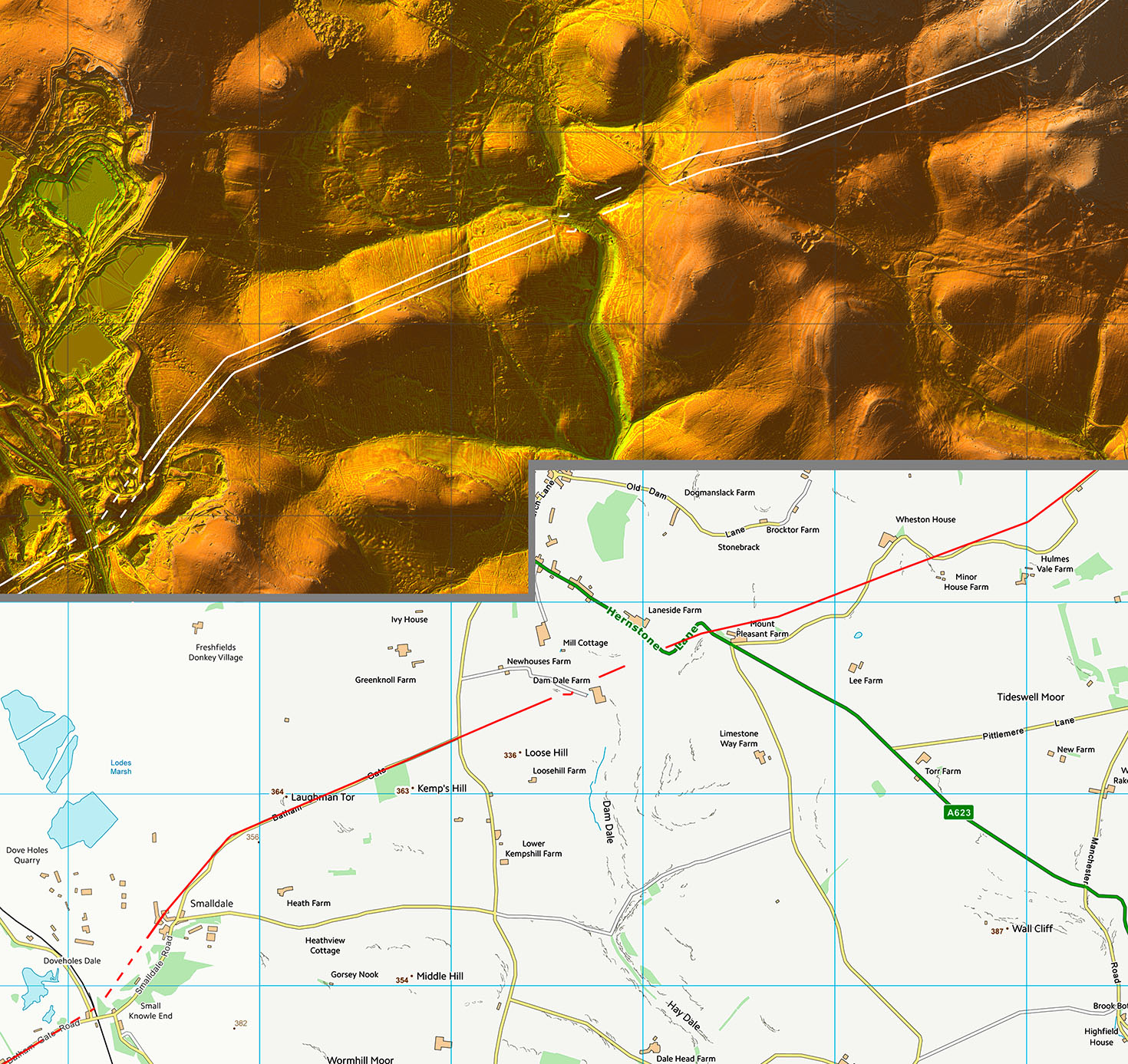 Beyond Smalldale then the modern Stretfield Road rides on a huge agger and must be the correct line.