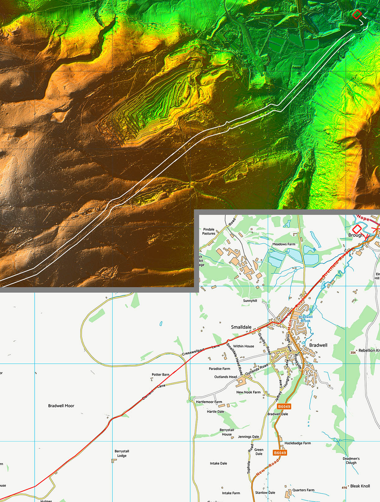 Smalldale is a natural dry valley linking the high ground with the valley floor. Very much the logical route down and a free bonus for the Roman road builders. A few minor zig-zags at the beginning (top) and at the bottom where the road becomes Gore Lane/Stretfield Road.