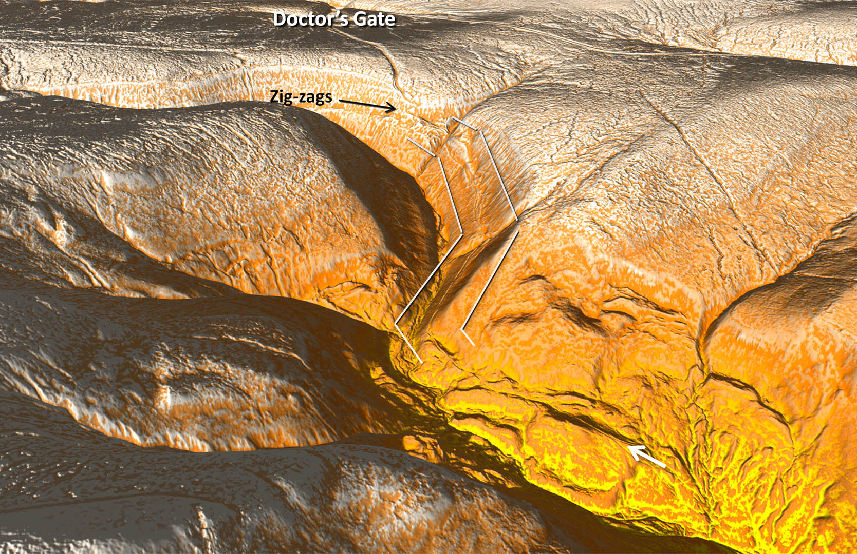 Lidar Image & Route Map 1 The various suggested routes Orange - Doctor's Gate |