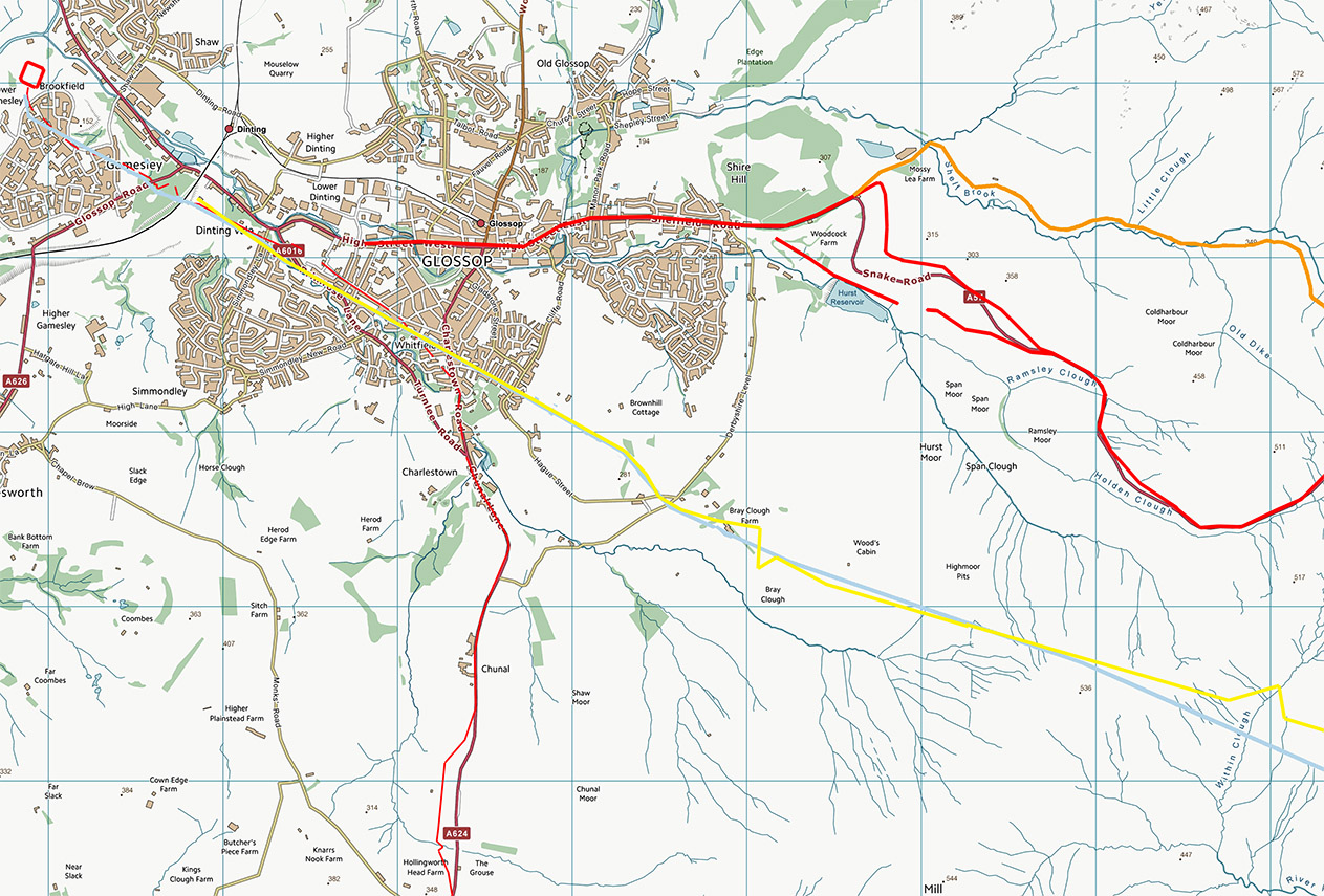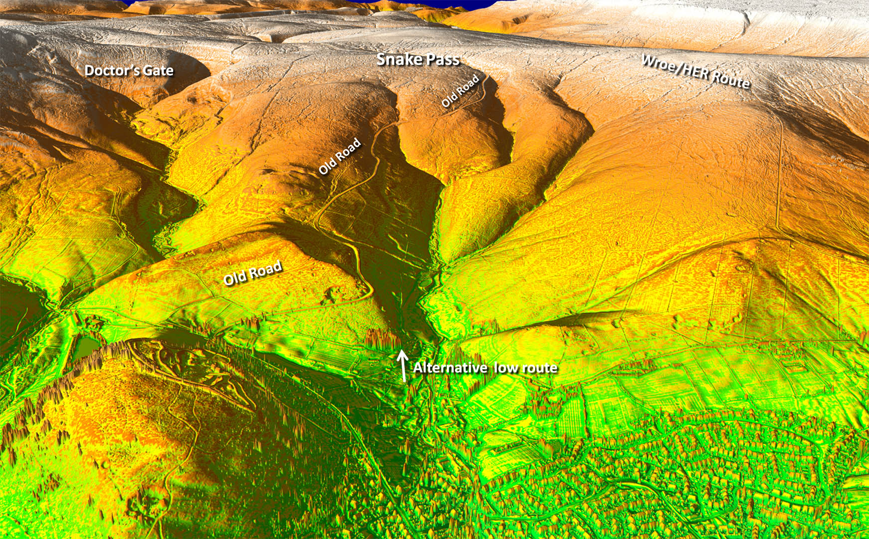 Lidar Image - Various Route Options The various suggested routes:- Orange - Doctor's Gate. Almost certainly a packhorse track |