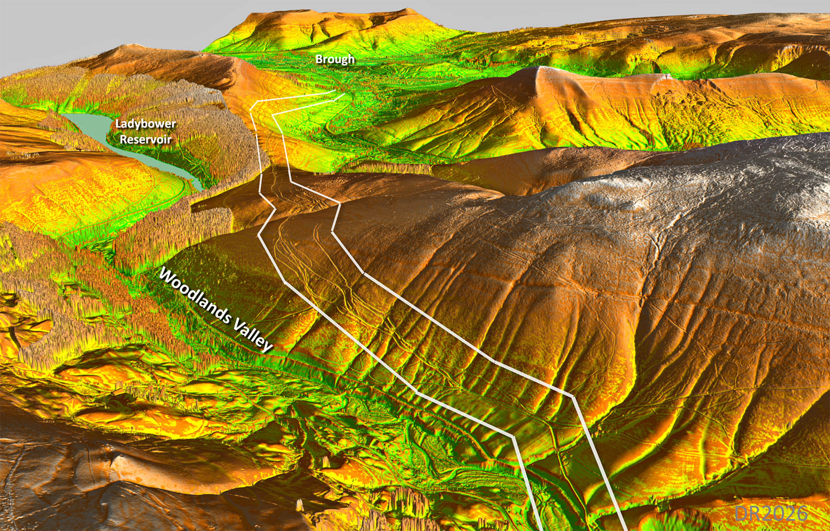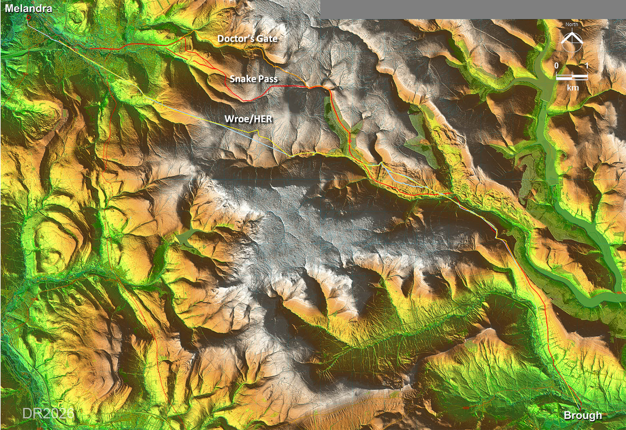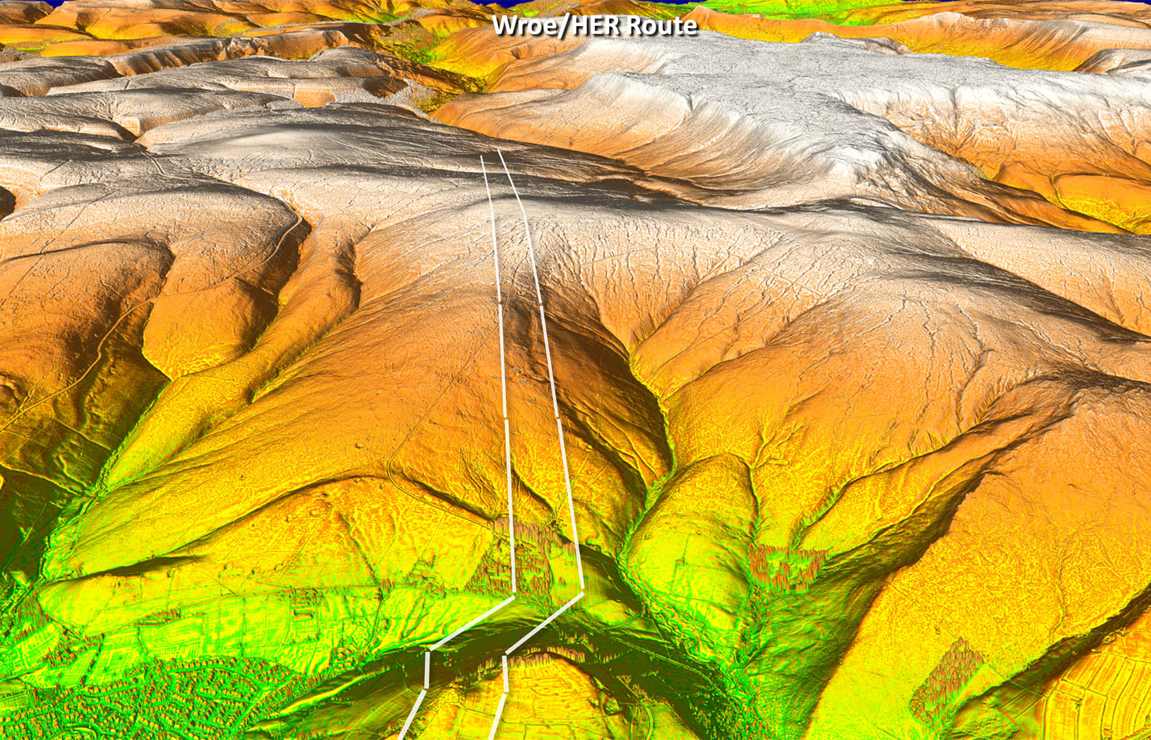 Oblique 3D Lidar Image - Peter Wroe & HER route Wow - that's an ambitious route! Yes it is direct and doesn't shirk at climbing. However, there is virtually nothing visible at all over the high ground. The almostl total lack of evidence must surely rule this one out. |