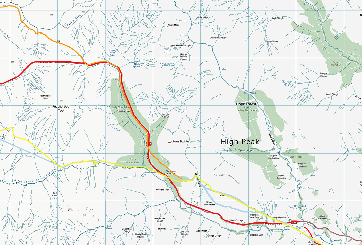 Oblique 3D Lidar Image - Snake Pass We are left with the infamous Snake Pass. Several instances of an older road visible alongside the modern road. There are also faint traces of a possible alternative straighter route but but not overly convincing ones - at least to me. Overall though it is the most practical route and that is why the modern A57 goes that way. |