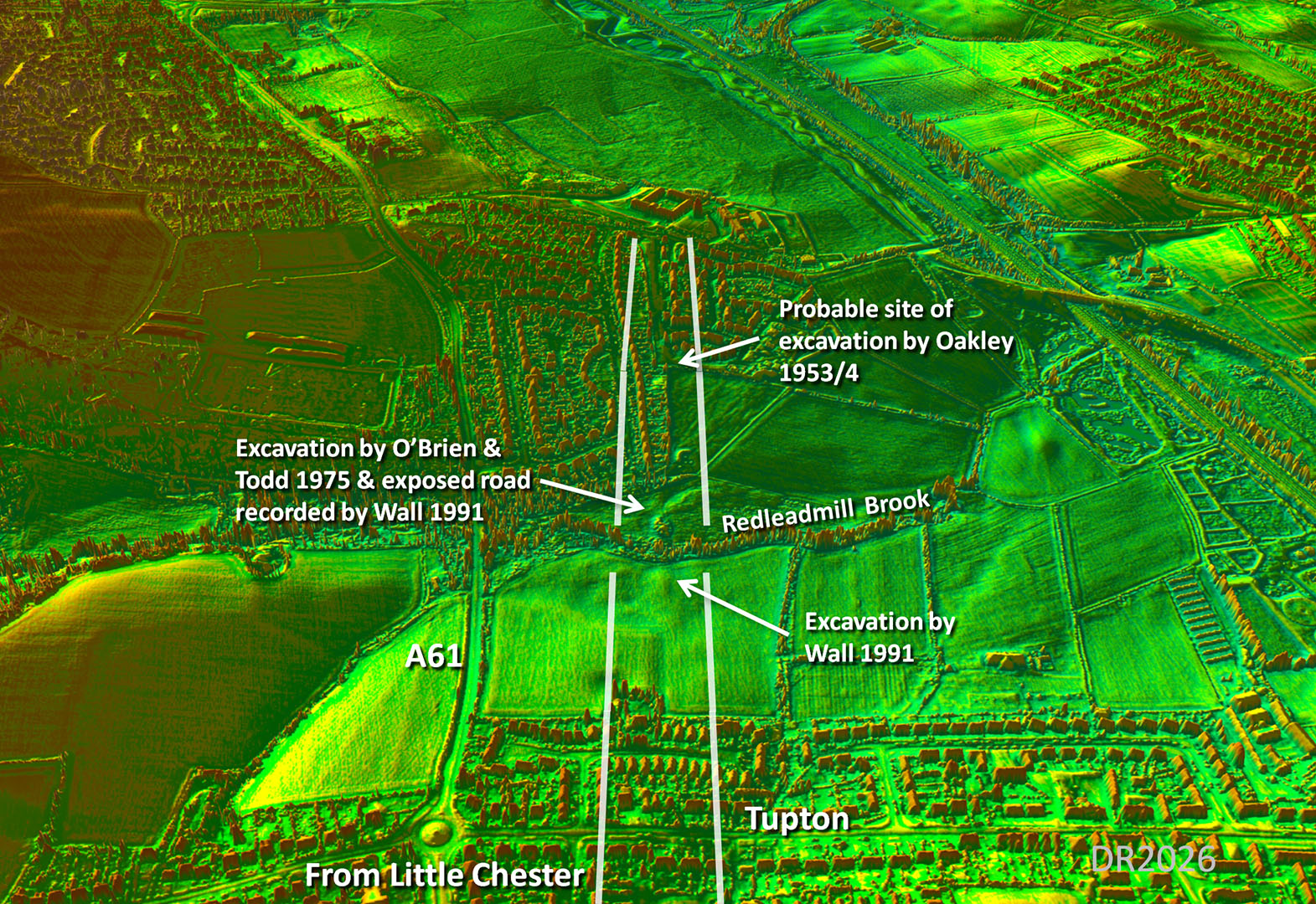 This spot alongside Redleadmill Brook has been the subject of no less than three separate excavations! Not only that but lidar shows the road clearly too. So definitely not in doubt!
