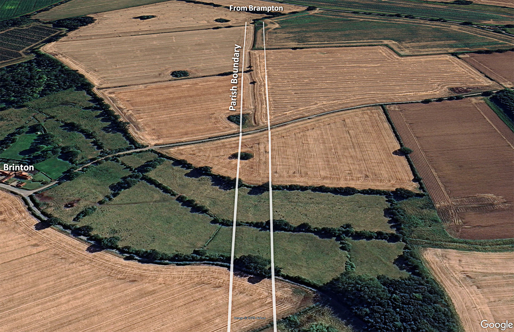 A rarity for this road is a parish boundary adopting it but passing Brinton we do have such a case. Again another valley to cross but with no access so again a Google image will have to suffice