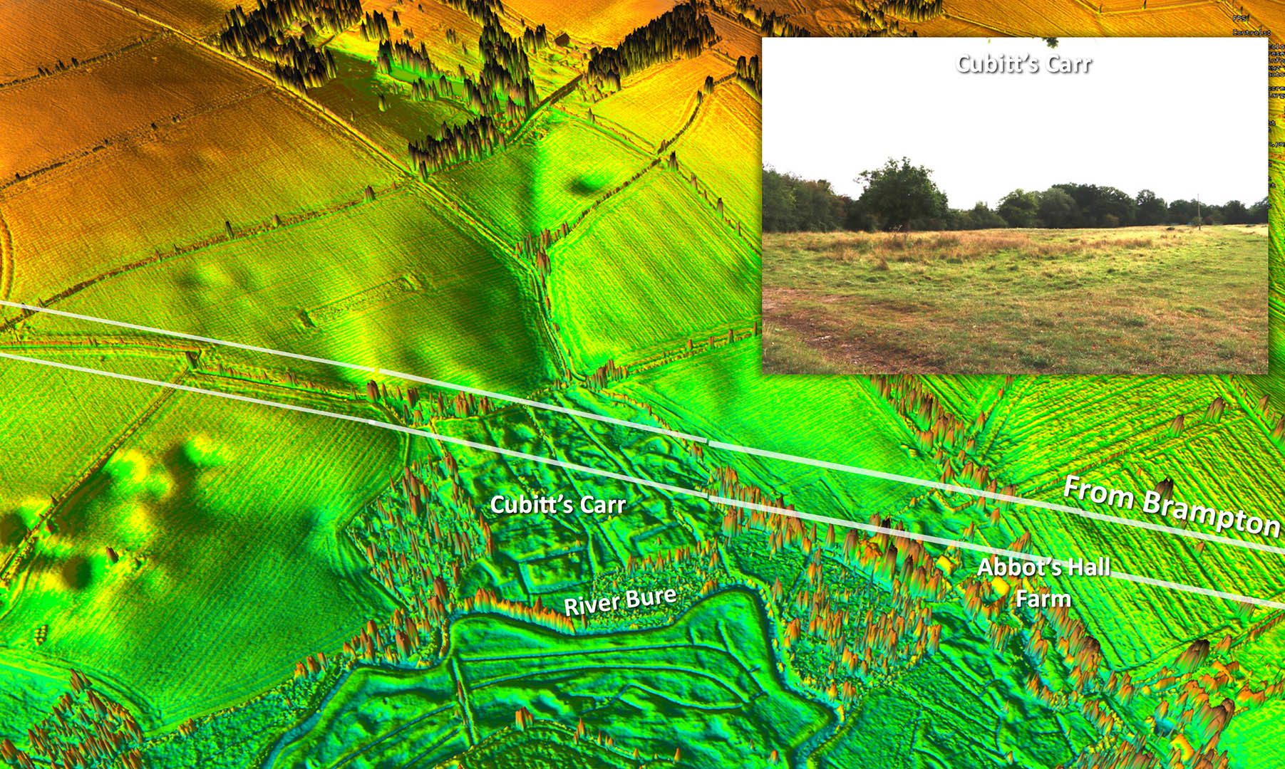 The route from the Roman town of Brampton is just to the west of the modern road at Oxnead. Most of the Roman road at Oxnead though has been destroyed by quarrying.Once the corner is turned then there is visible lidar evidence with it all aligning plus long lengths of the road's side ditches are visible in aerial photographs.