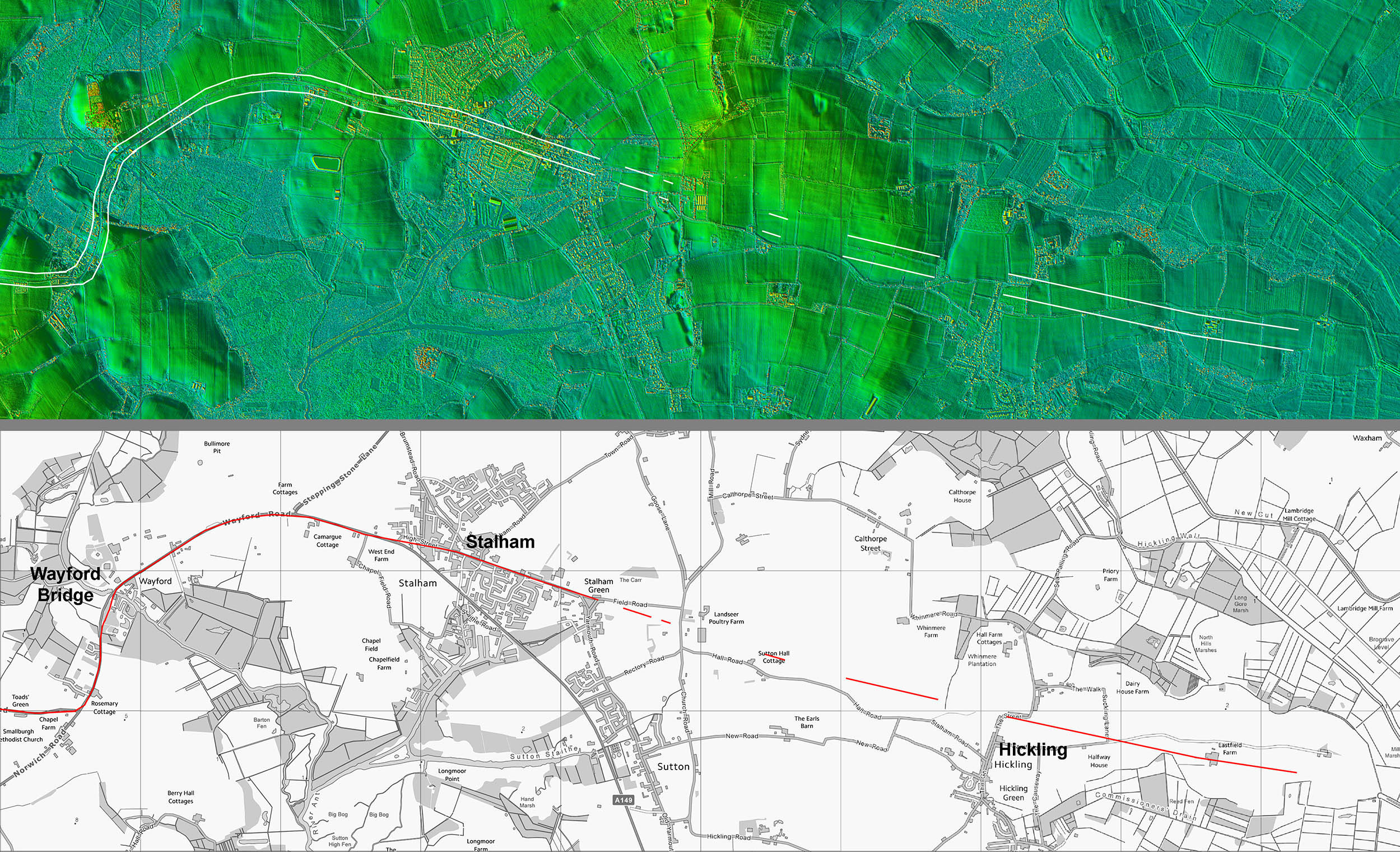 This stretch is mostly overlaid by the modern Anchor Street but the lidar data carries on to Smallburgh. |