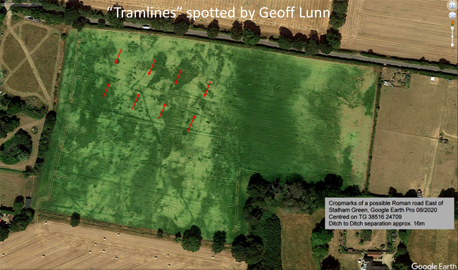 Just beyond the Stalham was where Geoff Lunn first spotted the tell tale signs of the Roman road crossing a field in aerial photographs. Commonly known as "tramlines" these are the Roman road ditches. This was the big clue that the road was not heading for Caister-on-Sea but to presumably the Roman coastline.