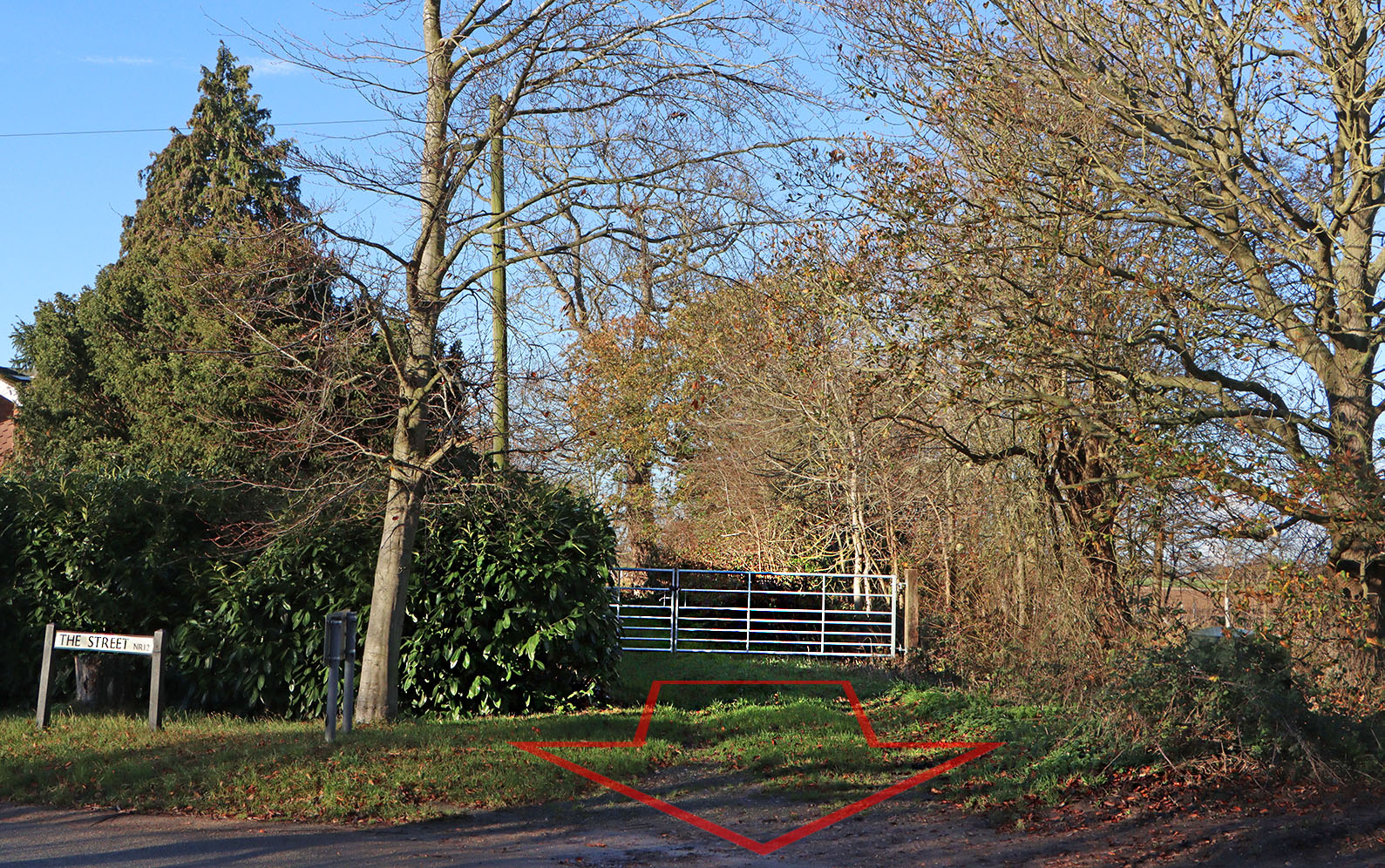 The Street in Hickling is not actually the Roman road but at its northern end then the road can be found. Beyond the gate the old track marks the Roman line. Behind us is High Hill (road) which drifts off the line, the Roman road divergies at a shallow angle on its southern side. The area is known as Town Street, presumably named after our road. |