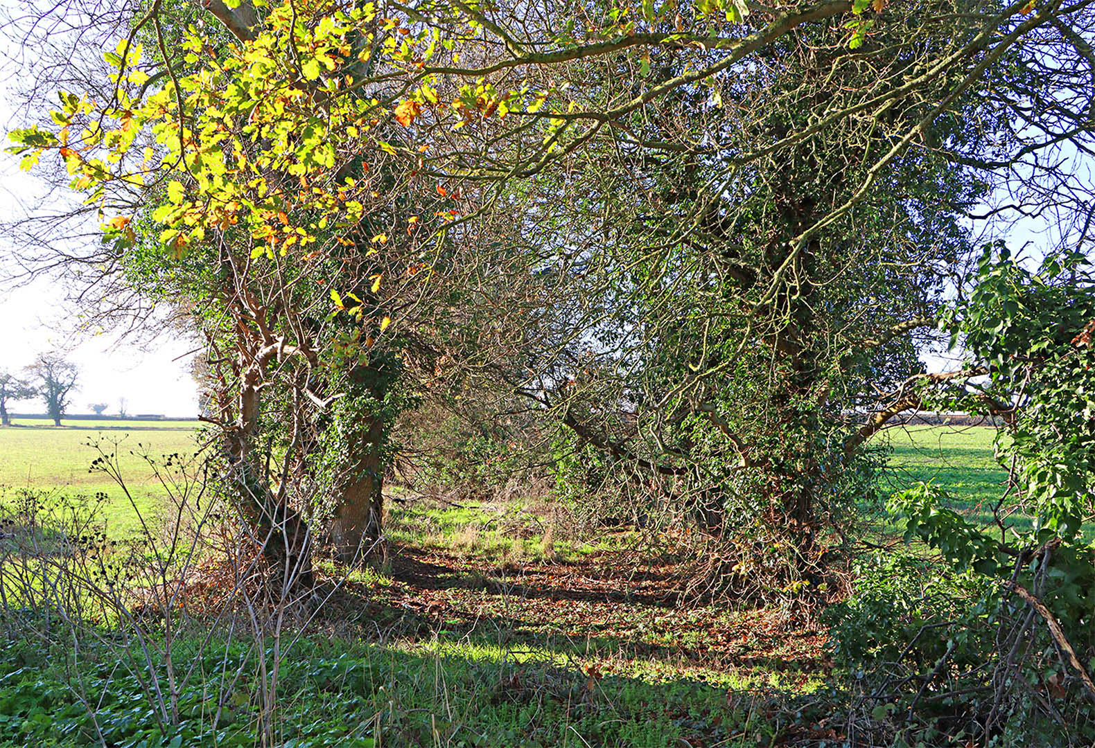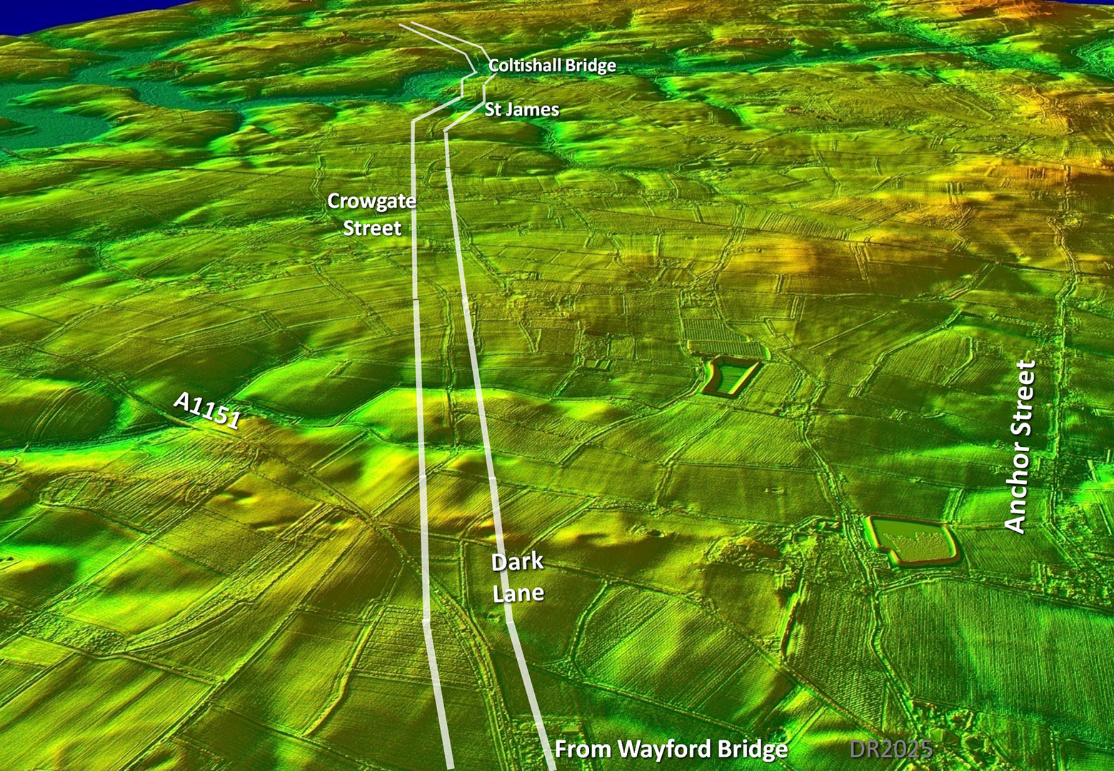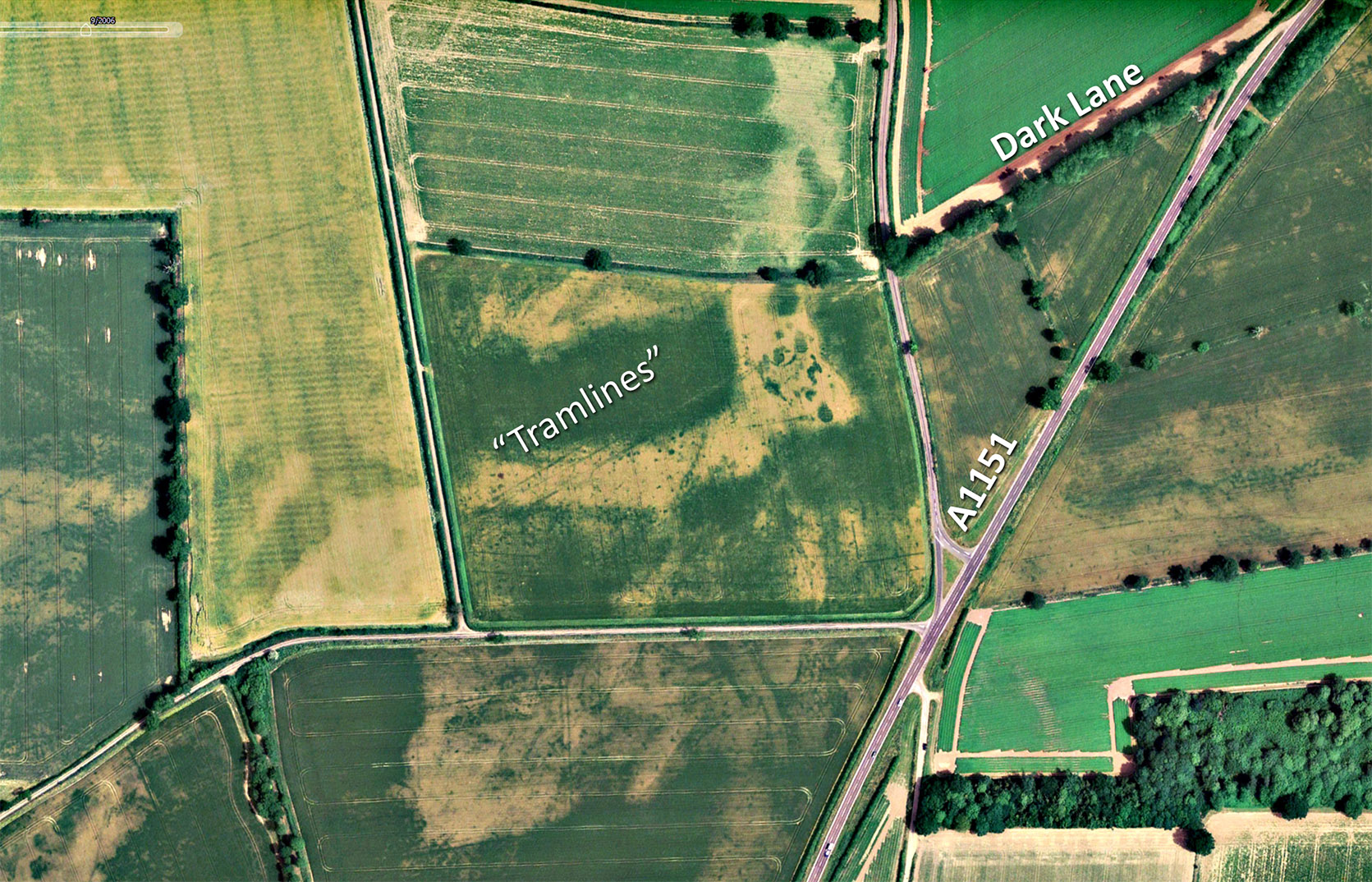 Tramlines, ie the Roman road ditches, are often a great clue to Roman roads when the agger has been ploughed away. Only the ditches survive. They continue the alignment of Dark Lane and onto the modern lane to Crowgate Street. Quite a significant name that with two road references within it - gate and street.