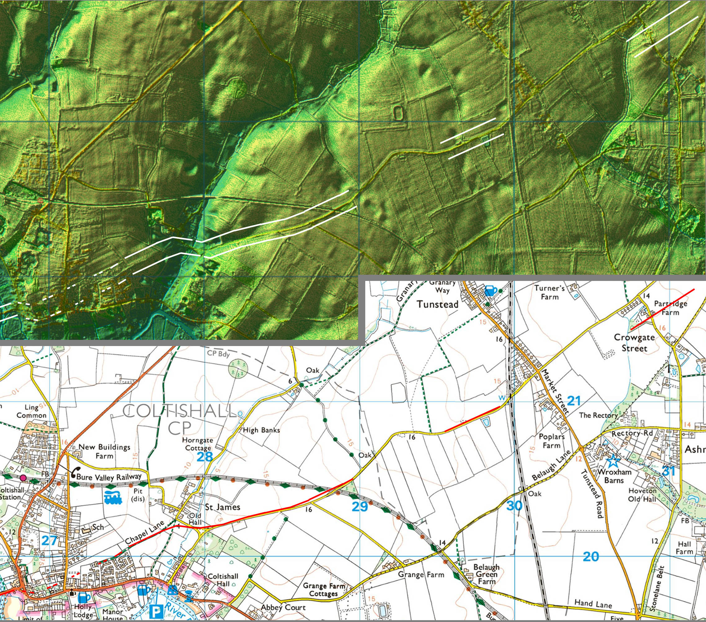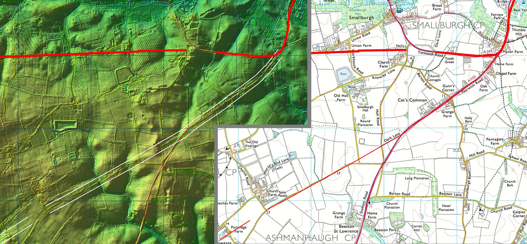 The target was obviously the crossing of the River Bure at Coltishall. The undulations here resulted in some adaptation to the line.