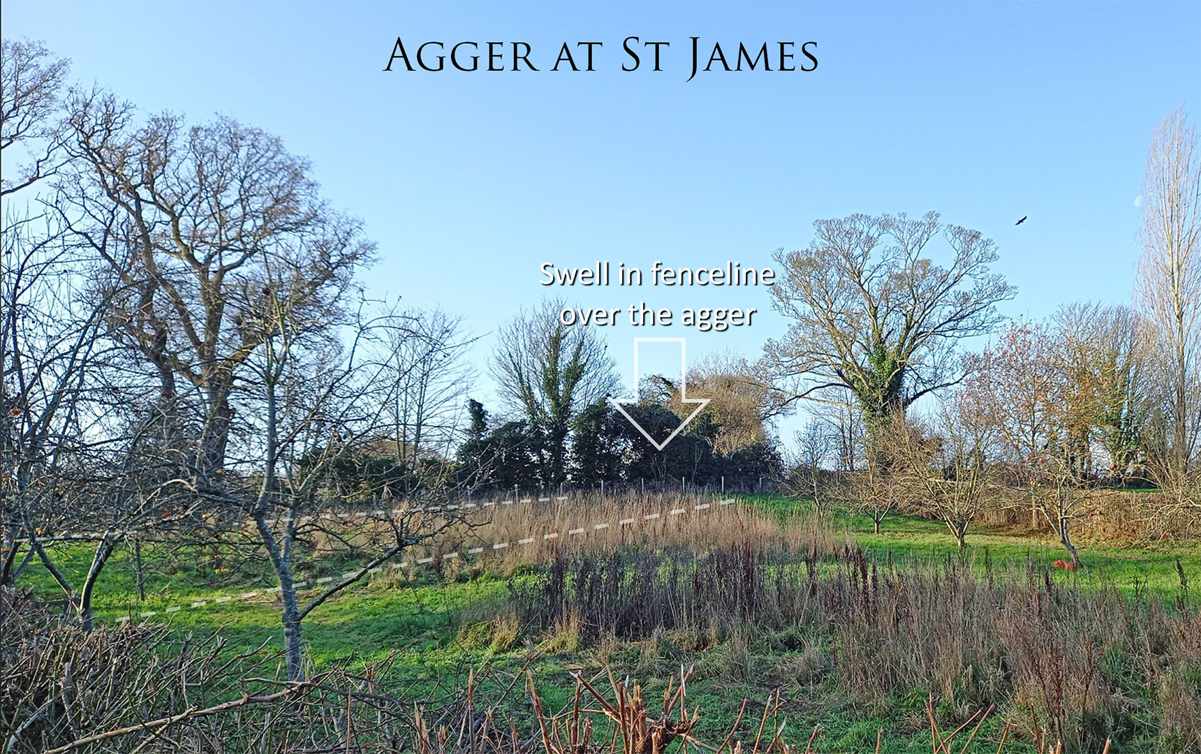 After crossing a stream in St James the road agger shows in two fields in the Lidar image - see above. The first field is tree covered but the second is more open and the agger can be made out in this view. Note also the swell where the far fence passes over the agger. A very common feature of Roman roads.
